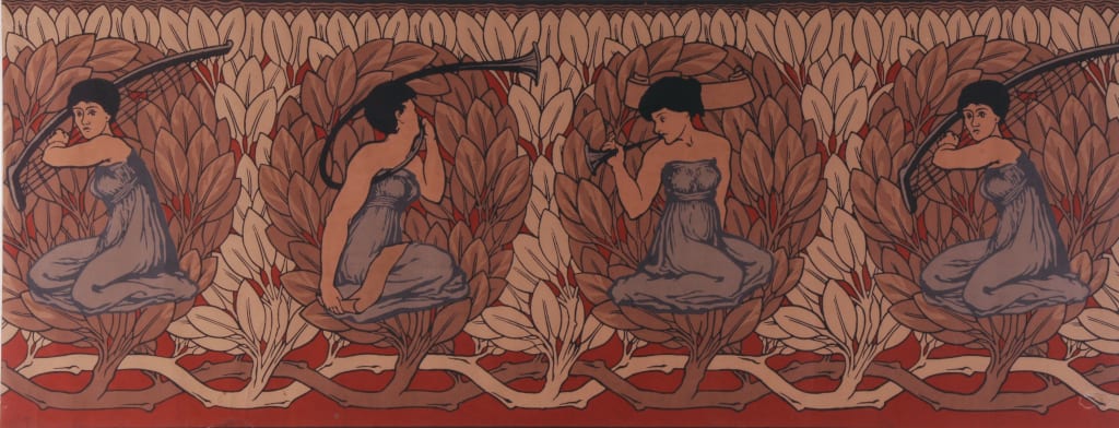 Works by the Guild typically incorporate motifs from the natural world with stylised natural forms evoking the sensation of nature without direct imitation. On display in the exhibition will be wallpapers and textiles intricately decorated with animals and flora such as peacocks, tulips and squirrels. Figures too were incorporated into these designs, something that was highly innovative for the time. Horne’s Bay Leaf Frieze (c.1882) depicts a repeating pattern of kneeling figures in classical robes, playing musical instruments against a frieze of bay leaves. The use of figures alongside sinuous natural forms foreshadowed Art Nouveau.