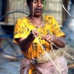 It takes three months to make one boat from lashed and sewn anjili wood, bamboo poles and coconut fibres, woven into Samson-strong rope by women’s hands and a home-made loom. Eager to show off their craft, we watched as the men hammered, bashed and sanded the base of the boat that would soon be sailing on the water.