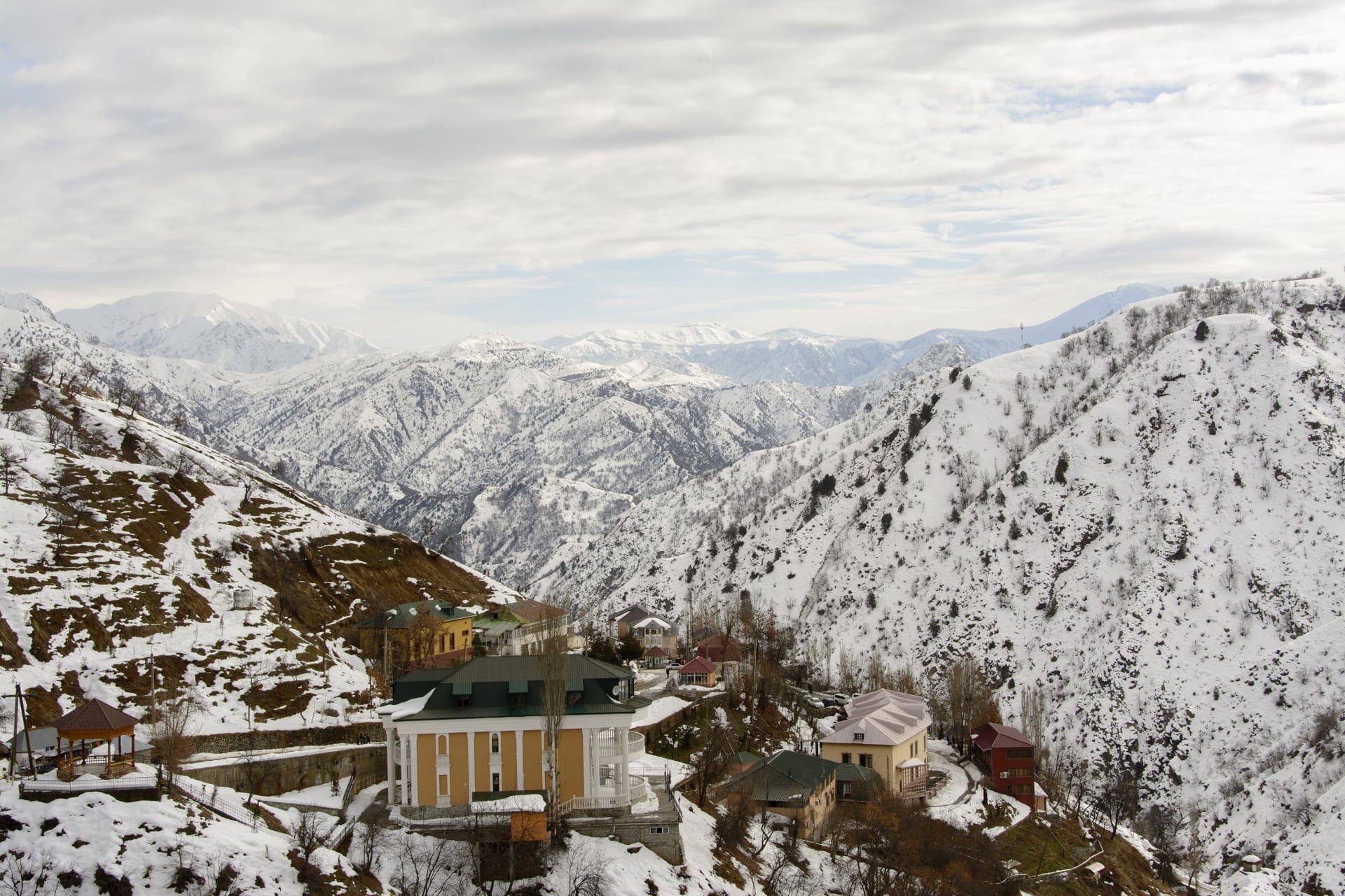 Although the sanatorium is located only 50km north of the capital Dushanbe, it’s a one-and-a-half hour journey by private taxi through a wild but graceful landscape. It’s winter and a white patchwork of snow has turned the surrounding mountainsides into a monochrome world, reinforced now and then by the royal-blue body of an abandoned Russian truck or the green, gabled roof of a single house.
