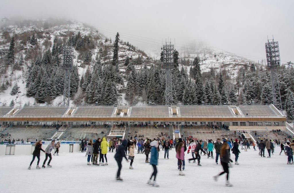 Medeu is a short, scenic taxi ride from Almaty centre (2,500 Tenge). Alternatively, take bus 6 or 12 (80 T) in front of the Hotel Kazakhstan, north of the intersection of Abai and Dostyk. Opening times: Tuesday to Sunday from 10:00 to 23:00 with a pause from 16:00 – to 18:00. Entrance is 1,800 T and renting skates will set you back around 1,000 T depending on the duration (bring your passport). Season runs from the end of October to March.