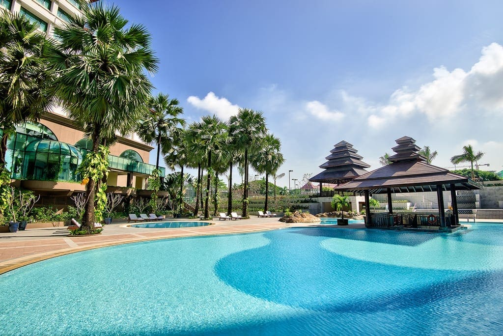 The seemingly endless facilities take in a spa, impressively-equipped gym, tennis courts and the city’s largest swimming pool. While dining options range from fine Italian fare at Orzo, oriental cuisine at Du Fu or an international buffet at D’Cuisine. The Lobby Lounge serves cocktails and other drinks.