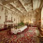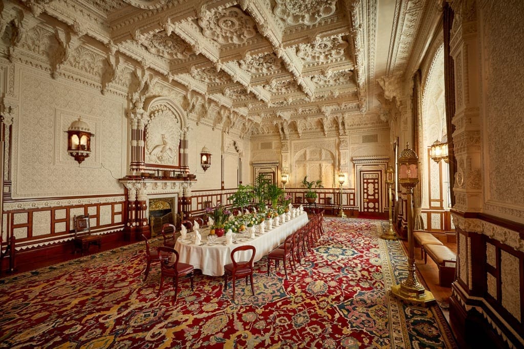Although Victoria became Empress of India in 1877, she never visited the country. Designed by Bai Ram Singh, the Durbar Room is in the style of an Indian Maharajah’s palace with its distinct white plaster work and teak wood. The magnificent white peacock that took more than 500 hours to create and which hangs over the fireplace is the room’s stand-out feature.