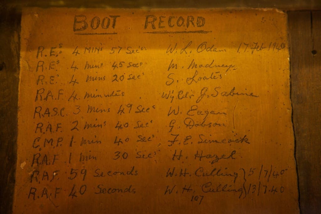 The results of the famed ‘Boot Record’ are among the extensive graffiti daubed on the walls of the ‘Airmen’s Bar’, alongside the names (with their home towns added) of many of the visiting American servicemen. Everyone in this wartime community, it seems, wanted to leave their mark on a memorable evening at The Swan.