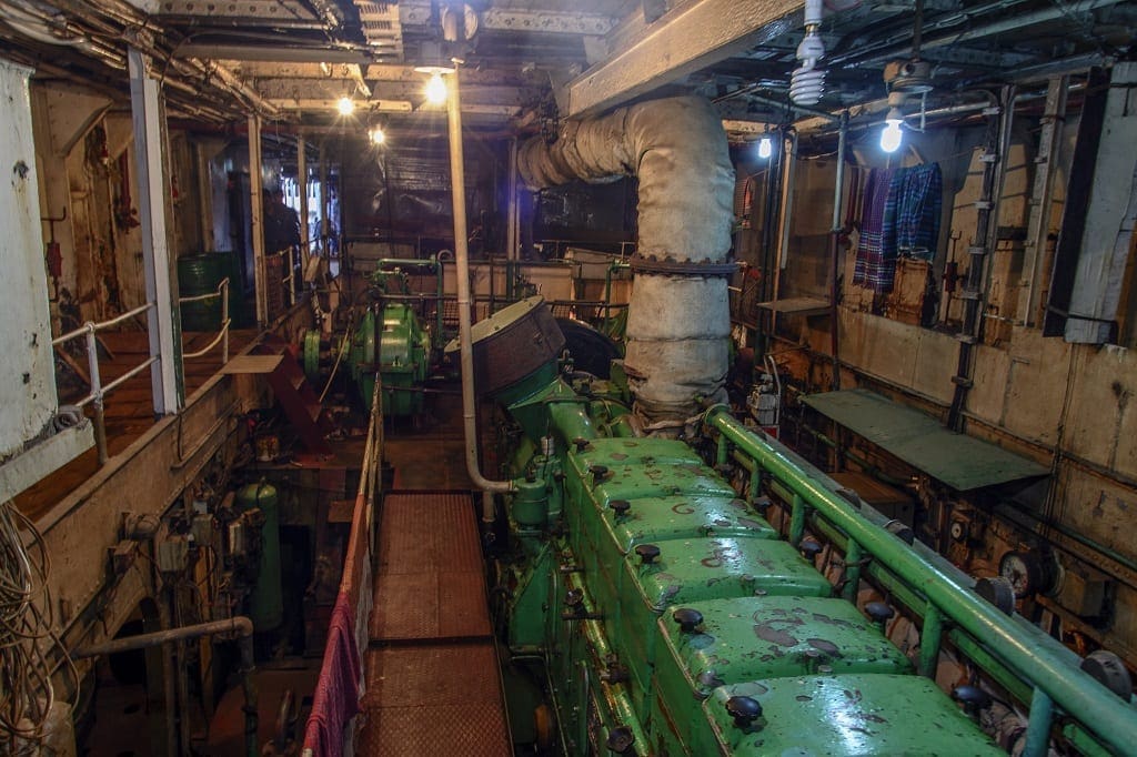 Unlike in other museums, nothing seems ‘off limits’. We go up to see the captain inside the small, dingy bridge that looks like an unkempt dorm room, we peek inside the grubby kitchen where the cook is cutting up vegetables, and we explore the massive engine that shudders and growls like a sick dragon inside the ship’s belly. It’s when we go down to the lowest level that we meet twenty-something Abdul, one of the crew.