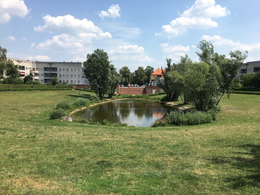 The most striking feature of the Hufeisensiedlung is its shape – Hufeisen is German for horseshoe. The 25 housing blocks are constructed around an inner park, which has a pond in the centre, apparently formed in the Ice Ages.