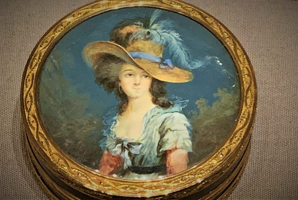Another shared passion within the family is gold boxes. I fell in love with a gold and turtle shell circular box of an unknown sitter – an 18th century lady wearing a wide straw hat adorned with a blue feather – painted by Swedish-French artist, Peter Adolf Hall. These samples are the gold boxes that remain after an infamous burglary in 2003, and now on public display for the first time since.