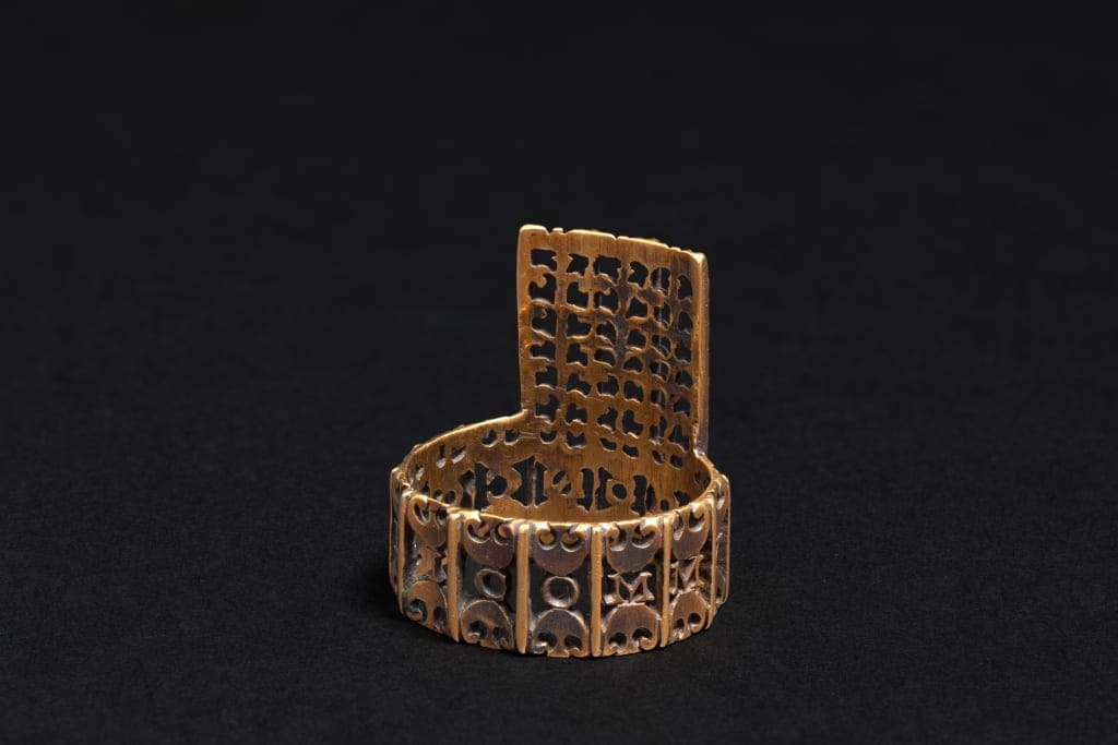 This section of the display showcases the Rothschilds’ continued involvement in sponsoring archaeological excavation work. Alongside the cameo is an unusual gold engagement ring dating to the 2nd century and excavated in Tienen, Belgium in the 19th century. The most important pieces from this excavation were sold in benefit of the local communities, and Baron Edmond purchased the cameo and gold ring.