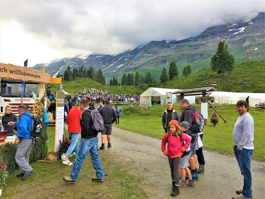 In front of us, four sand rinks are marked in the ground. Some 100 or so competitors have assembled from across Switzerland. A series of bouts will determine who proceeds to the next round and so on until the final held tomorrow. The winner will take home a cow. In the distance men are playing alphorns on the hills, creating a mournful sound that reminds me of The Last Post.