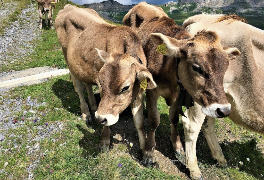 In total, we walk some nine miles, more up than down, taking us about 4.5 hours, stopping for a pack lunch of local Swiss cheese, sausage for the meaties, and fresh bread, while admiring the phlegmatic cows.