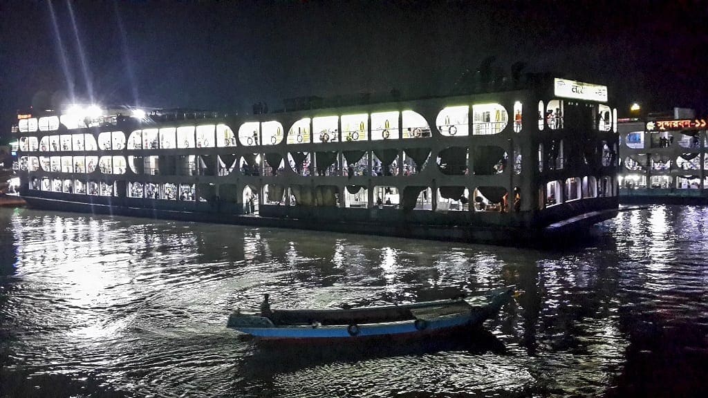 In as much as riding the Rocket is the epitome of nostalgia and romance, a nighttime trip on a launch is an exercise in conquering acute anxiety. Overloaded barges, multi-storey ferries, huge freighters and even rubber dinghies crisscross at varying speeds on the ink-black waters all around us. Our launch has one huge headlight that is scanning the waters frantically like a World War II searchlight looking for enemy aircraft. Some of the vessels have their own search lights but many are sailing blindly on a prayer. Moreover, Bangladesh’s waterways have a reputation for being amongst the world’s most dangerous, and our destination of Chandpur, located at the confluence of the Padma, Buriganga and Maghna rivers, is infamous for major boat crashes.