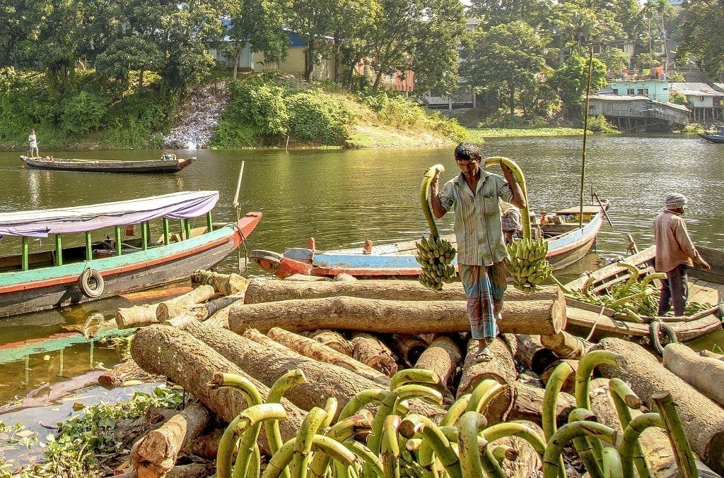 Kaptai Lake is simply stunning. It’s sprinkled with islands of all sizes, home to tribal villages and wild nature. The long boat ride to the Shuvalong Falls takes me past scenic views and through a gorge whose steep sides are covered in dense vegetation. Meanwhile, local river traffic passes us on all sides, from fishermen in dugout canoes casting their nets to wooden barges overloaded with goods. A lone man is killing time smoking a large hilltribe pipe while his boat is slowly pulling a huge raft of freshly-cut bamboo.