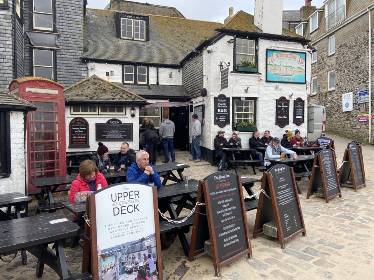We take a drink in The Sloop Inn, said to be founded around 1312, and keeping our safe distance from the other punters, watch as nothing really seems to happen. In the summer this place will be throbbing with tourists, but now with most flights grounded and tourists temporarily unwelcome there is an unfamiliar calm to the place, which I confess to liking. In truth, I have been perfecting the art of self-isolation throughout my life.
