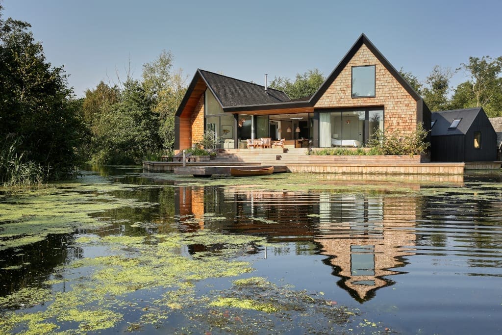 The search for a site eventually yielded a rundown 1950s timber home, an ugly-looking bungalow at the end of a long private road in Wroxham with its timber piles rotting as they sank into the water. Once he had knocked it down, Patrick set about building a house that would incorporate the Edwardian-style architecture of many of the local industrial boat buildings with his own contemporary design.