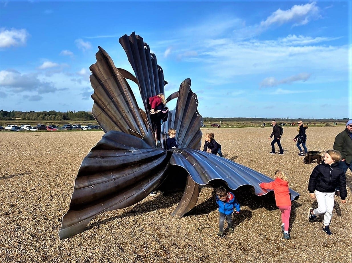At the far end of the beach lies Scallop, a tribute to Britten by local sculptor Maggi Hambling – she of Mary Wollstonecraft fame – , with the words, “I hear those voices that will not be drowned”, etched on it. Judging by my visit which coincided with half-term, the sculpture has proved extremely popular with children who view it as an impromptu adventure playground.
