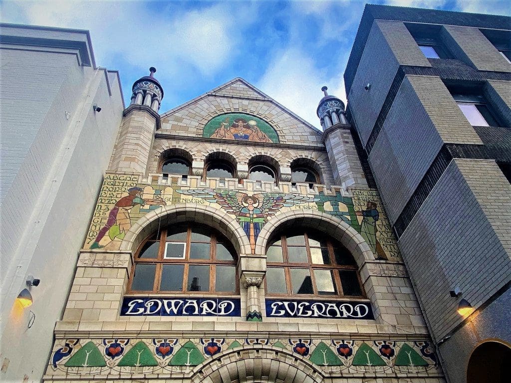 Exiting I noticed that The Strawberry Thief is next to the Palestinian museum and cultural centre and on the street as the Guildhall and the Grand. Across the street is Everards Printworks building. Built in 1900s and designed by Henry Williams it has a stunning art nouveau facade created by William Neatby, which is currently being restored.