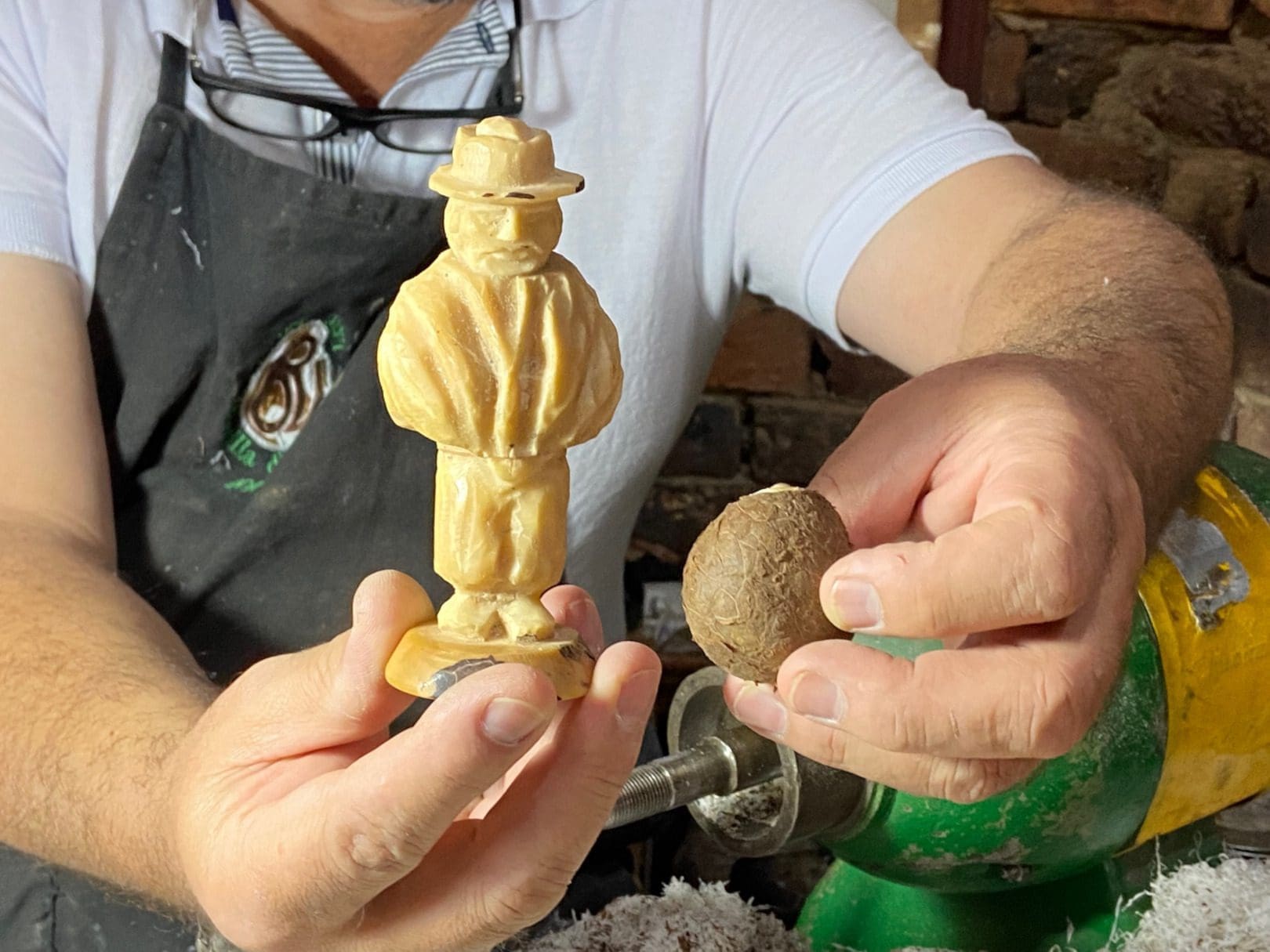 In the nearby town of Tinjaca, Juan Cesar Bonilla shows us how he can make small figurines from the seeds of a tagua palm in his small workshop. The seeds have 90 percent of the properties of ivory he informs us.