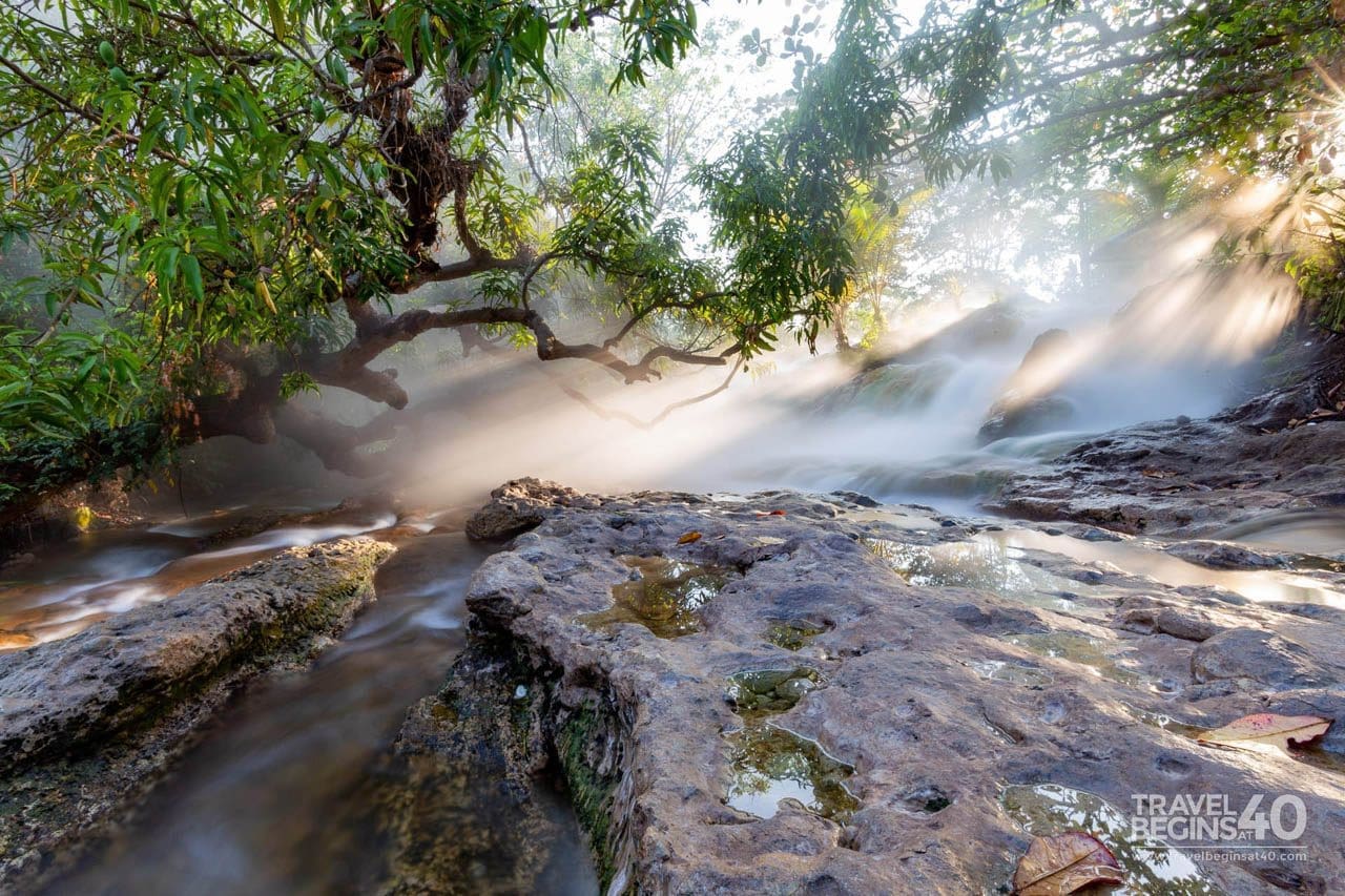 Magical hot springs on the slopes of a volcano. The hot water streams over a small waterfall and mixes with the cool water in the small stream. A perfect start to the day as the morning light shines through the steam rising in the cool morning air.