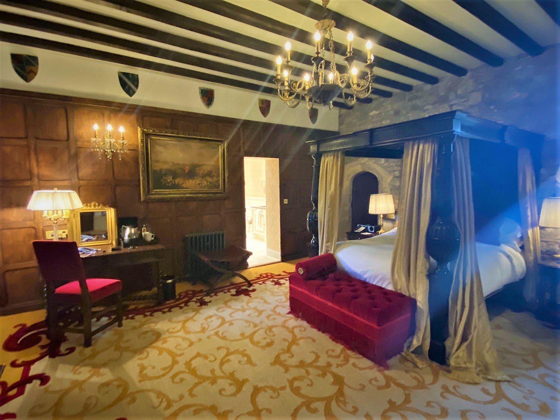 My bedchamber was in the West Wing. A bottle of sloe gin from a local distillery awaited me, a nice touch. Pride of place was the four-poster bed, although the ornate fireplace gave it a good run for its money. There was also a secret door that led to the bathroom, where the most funky window I have ever seen provided light – it was burrowed into the old castle walls.