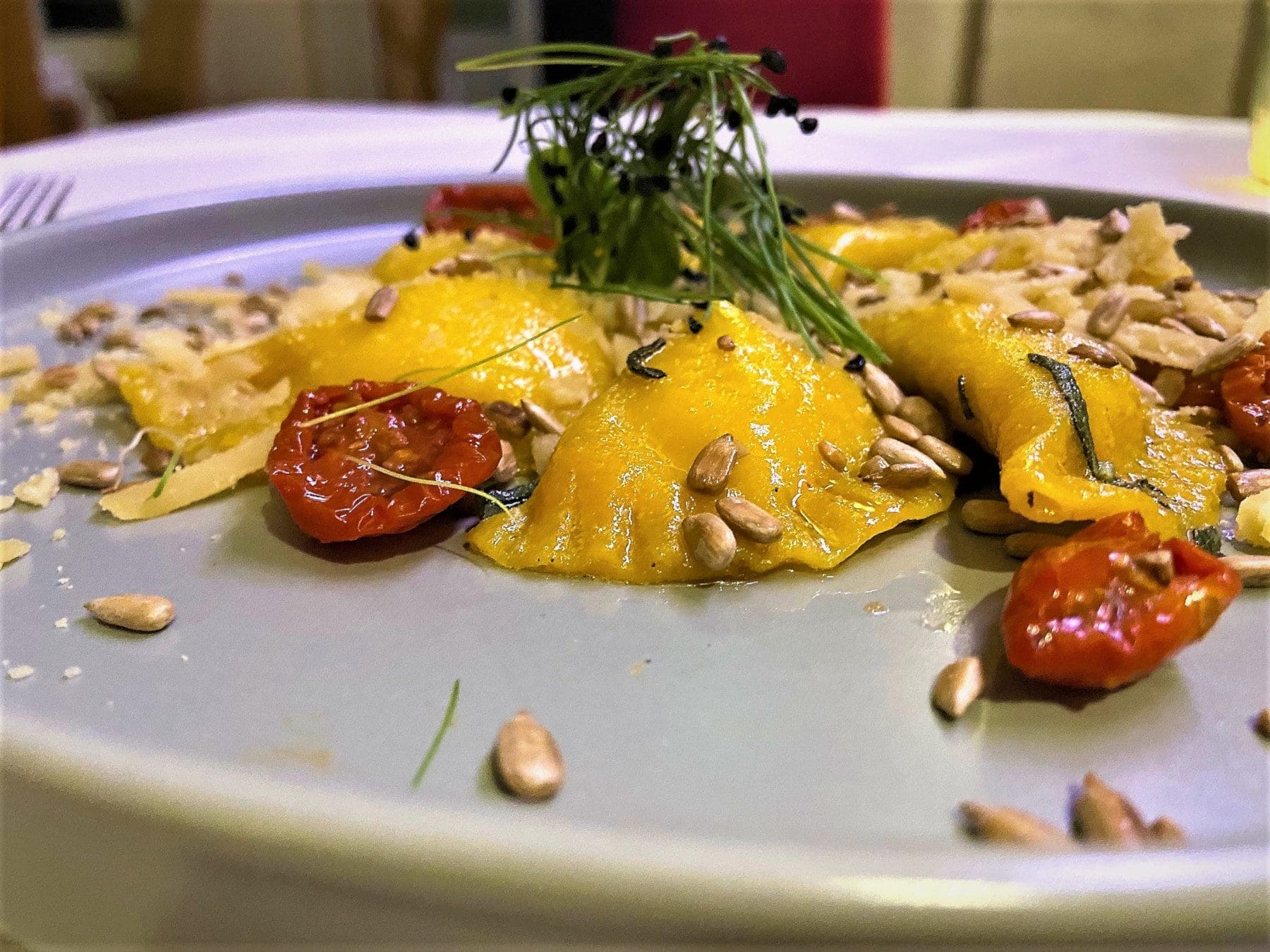 I started with an artichoke carpaccio, with tasty chunks of artichoke accompanying a generous helping of salad. This was followed by a vegan ricotta ravioli served with sage butter. Unlike other vegan dairy substitutes, I was unable to detect any difference between this and traditional ricotta – great news for someone who tends towards lacto-intolerance. It was perhaps a tad on the lemony side for me, but the pine nuts were simply divine.