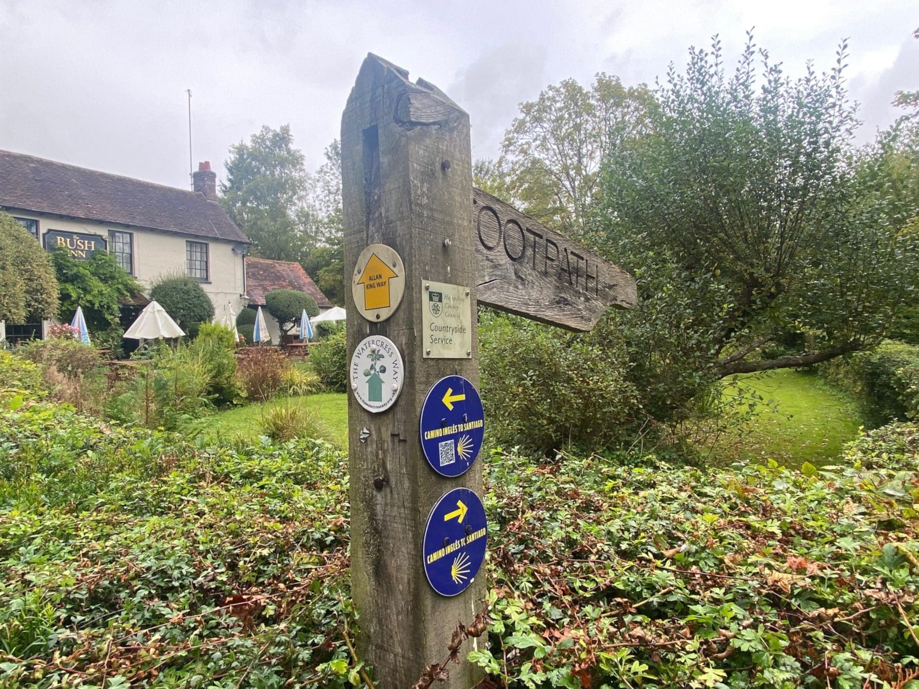 A path indicates the Camino Ingles, as well as St Swithun’s Way and The Watercress Way, just to leave me in no doubt that I am on the right path. The tree covering proves timely as it starts to rain.