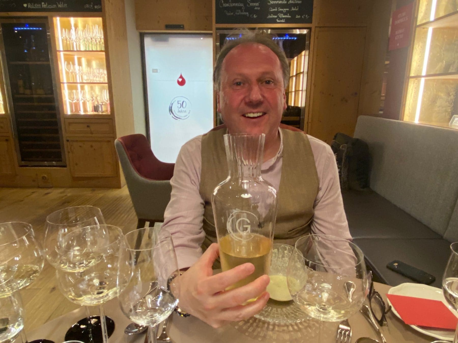 “His idea and my money,” laughs Sepp over a welcoming glass of champagne in his unique room – the only one in Europe, where they have ‘glass tastings’.