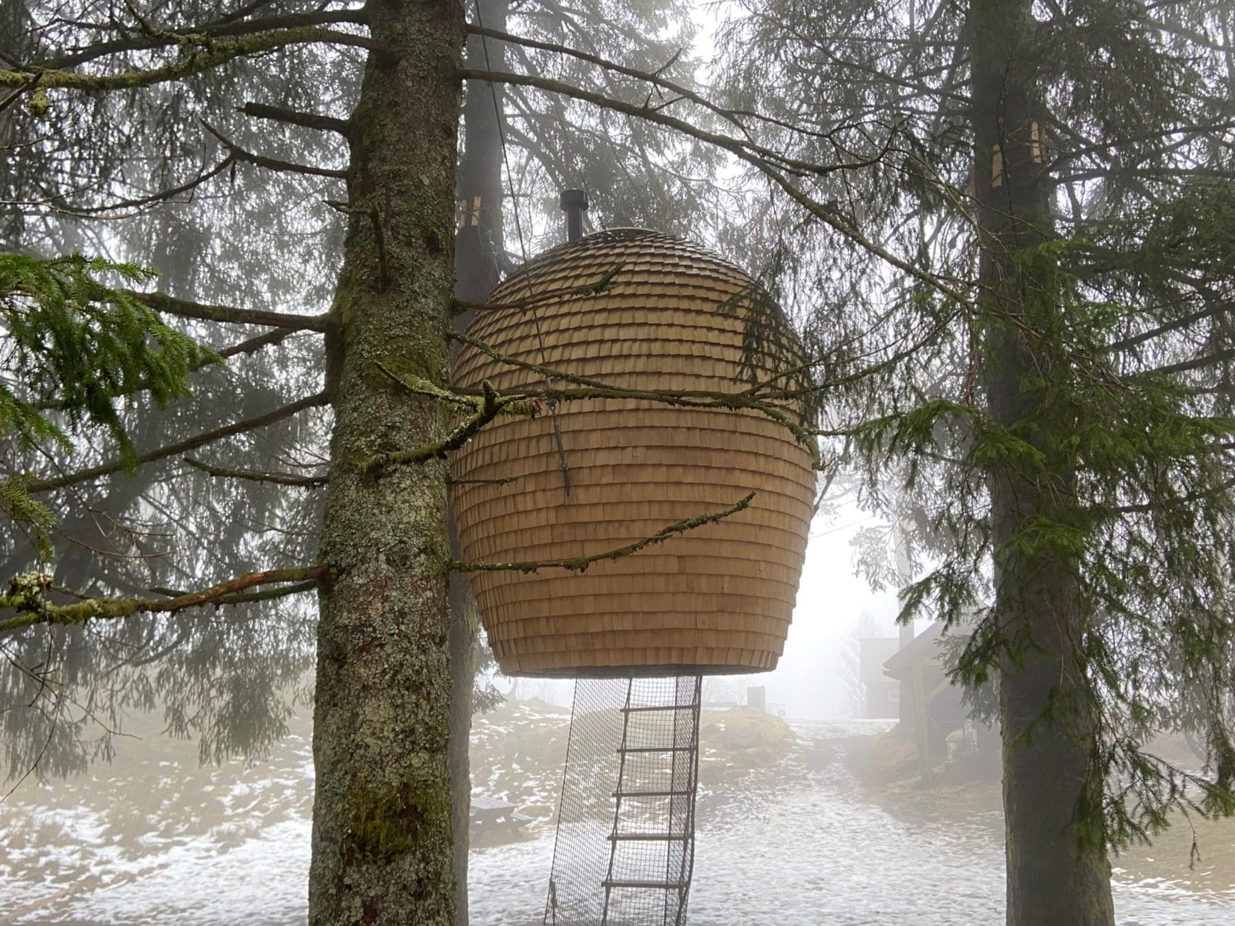 After a short walk around the forest where sadly we did not spot any real trolls we headed off to a hut for lunch. If you wish you can go for extended hikes around the mountain or even walk back into Bergen. While waiting for our lunch – a hearty and tasty vegan soup – to cook we have a quick look at one of the most unusual places to stay in Bergen. From one of the trees a cone hangs like a giant beehive. You can hire it for the night ensuring one of the most amazing glamping experiences so long as the trolls don’t disturb you at night.