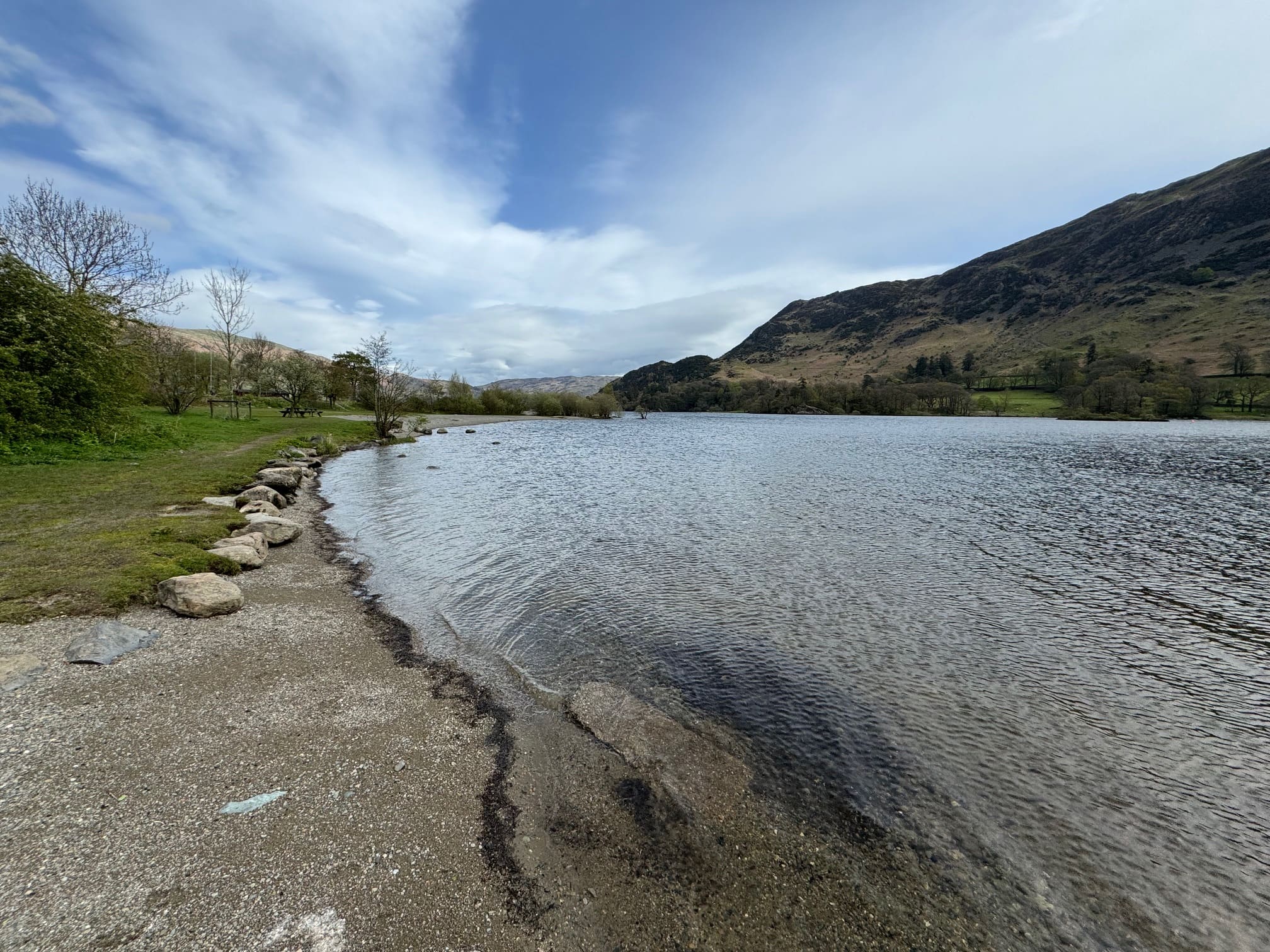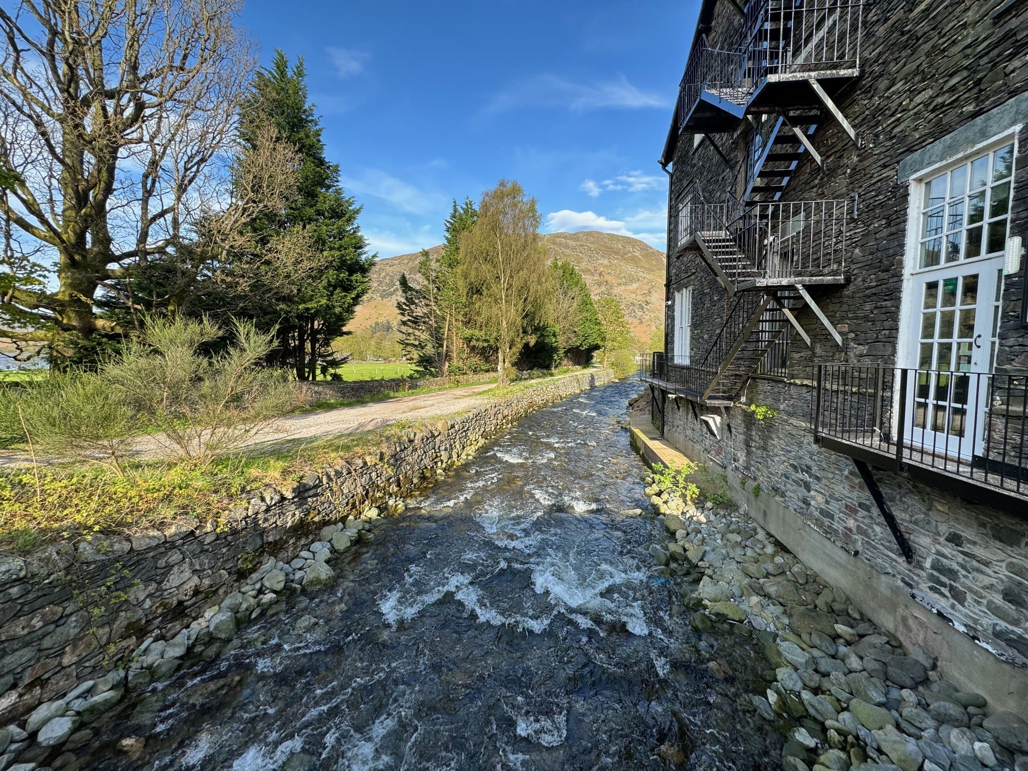 Although Glenridding is little more than a village, it has quite a few dining options. For lunch, I enjoyed an excellent vegetable soup with cheese scone at Helvellyn Country Kitchen. Mum had a spicy prawn dish and I had a vegetable soup with cheese scone. However, the highlight was to sit outside on the terrace and listen to the stream flowing past with the hills in the distance. At least at this time of year (end of April) Glenridding is a great place to relax.