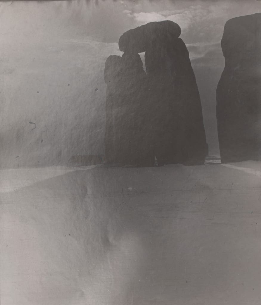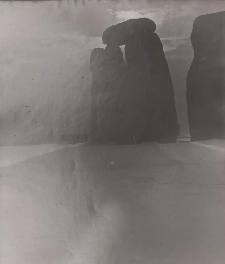 In the years following the war both artists turned to nature, and the light in open landscapes, as a source of inspiration. A significant section of the exhibition looks at their enduring interest in rock formations, geological artefacts and megalithic sites, including Stonehenge. Moore’s drawings of the ancient monument are in close-up showing the rough, imperfect surface of the stones. In contrast, Brandt’s photographs are taken from a distance and in Stonehenge (1947); the stones appear wraithlike, surrounded by a mist with a suggestion of sunshine breaking through the blanket of clouds.