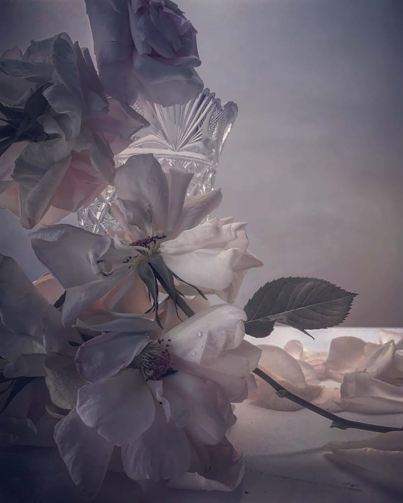 Knight selected cut roses from his garden and these have been artfully arranged. Using only daylight to illuminate his subject, the digital images have been enlarged and filtered through software that uses Artificial Intelligence to infill the space between pixels. Printing on photographic paper loaded into the printer upside-down, prevents the ink being absorbed by the correct surface.